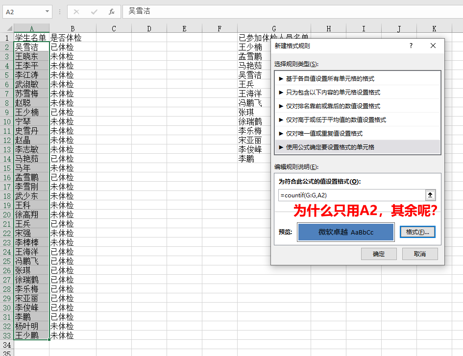 无论是格式化规则,还是图形化规则,默认都是针对数据本身所在的单元格进行视觉化 强调。如果想让符合某个条件的整行都自动变色,该怎么做呢?这就需要用到更高级别的自定义规则:公式。