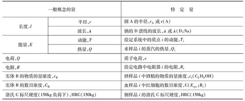 表1-1 一般概念的量与特定量的区别及量的名称和符号