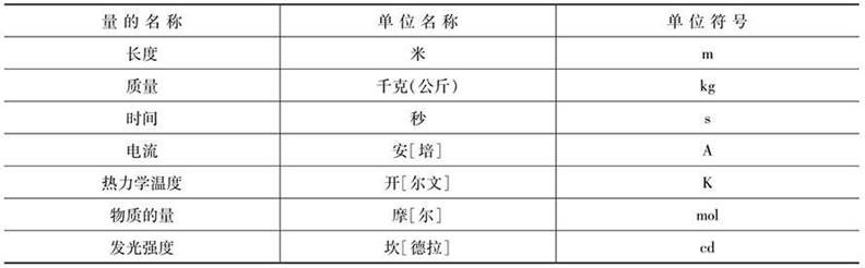 (1)SI基本单位要建立一种计量单位制,首先要确定基本量,即约定在函数关系上彼此独立的量。SI选择了长度、质量、时间、电流、热力学温度、物质的量和发光强度7个基本量,并给基本量的计量单位规定了严格的定义。SI基本单位是SI的基础,其名称和符号见表1-3。