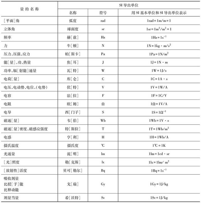 注:1.圆括号中的名称,是它前面的名称的同义词。 2.无方括号的量的名称与单位名称均为全称,方括号中的字在不致引起混淆、误解的情况下,可以省略,去掉方括号中的字即为其名称的简称。 3.在日常生活和贸易中,质量习惯称为重量。 1)米:光在真空中于l/299792458s的时间间隔内所经过路径的长度。 2)千克:等于国际千克原器的质量。 3)秒:铯-133原子基态的两个超精细能级之间跃迁所对应的辐射的9 192 631 770个周期的持续时间。 4)安[培]:在真空中,截面积可忽略的两根相距1m的无限长平行圆直导线内通以等量恒定电流时,若导线间相互作用力在每米长度上为2 ×10-7 N,则每根导线中的电流为1 A。 5)开[尔文]:水三相点热力学温度的l/273.16。水的三相点是指水的固态、液态和气态三相间平衡时所具有的温度。水的三相点温度为0.01 ℃。水的三相点温度和三相点压力是唯一确定的。 6)摩[尔]:一个系统的物质的量,该系统中所包含的基本单元(原子、分子、离子、电子及其他粒子,或这些粒子的特定组合)数与0.012 kg碳-12的原子数目相等。在使用摩[尔]时应指明基本单元, 可以是原子、分子、离子、电子及其他粒子,或是这些粒子的特定组合。 7)坎[德拉]:一光源在给定方向上的发光强度,该光源发出频率为540×1012 Hz的单色辐射,且在此方向上的辐射强度为(1/683)W/sr。其中频率540×1012 Hz的辐射波长为555 nm的波是人眼感觉最灵敏的波长。 (2)SI导出单位 SI导出单位是一贯制单位,通过数字因数为1的量的定义方程式由SI基本单位导出,并由SI基本单位以代数形式表示的单位。 为了读写和实际应用的方便,以及便于区分某些具有相同量纲和表达式的单位,国际计量大会通过了一些具有专门名称和符号的导出单位。初期仅选用了19个,后来增加弧度和球面度2个辅助单位,具有专门名称和符号的SI导出单位达到了21个,见表1-4。 表1-4 包括SI辅助单位在内的具有专门名称的SI导出单位