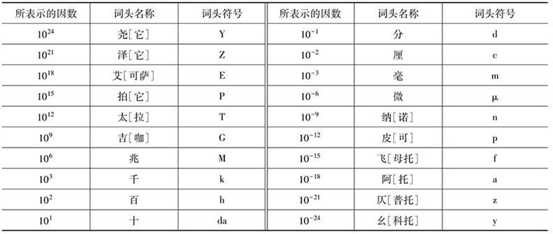 注:1.词头符号一律用正体;106及其以上的词头符号用大写体,其余皆用小写体,词头不能无单位单独使用,必须与单位合用。 2.方括号中的字,在不致引起混淆、误解的情况下,可以省略。去掉方括号中的字,即为其名称的简称。