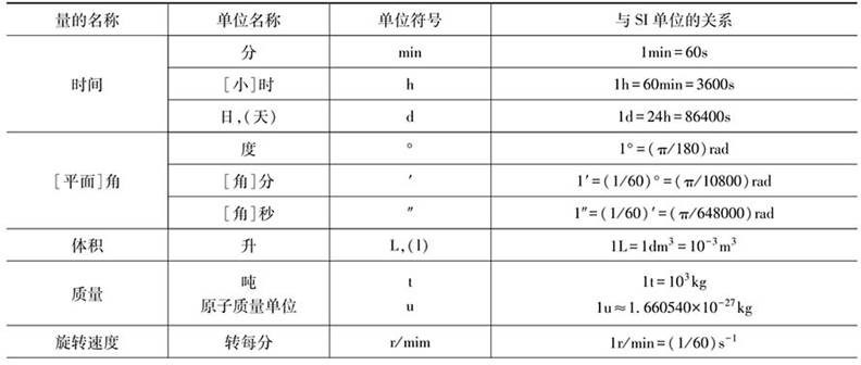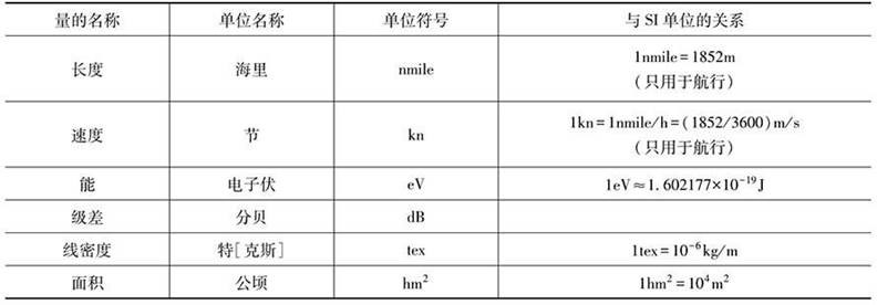 在表1-6中所列的可与国际单位制单位并用的我国法定计量单位,大多都是从国际计量委员会考虑到某些国家和领域的实际情况而公布的,可以与国际单位制并用或暂时保留与国际单位制并用的单位制中选取的,具有较好的国际适用性。 表1-6 可与国际单位制单位并用的我国法定计量单位